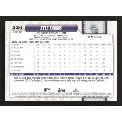 This is a 2026 Topps Kyle Karros baseball card. The card is #334 and pictures show condition.