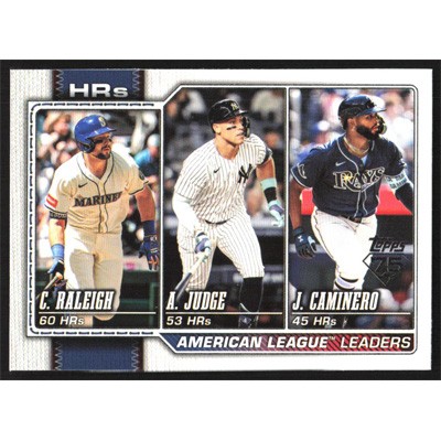This is a 2026 Topps Cal Raleigh, Aaron Judge and Junior Caminero League Leaders baseball card. The card is #38 and pictures show condition.