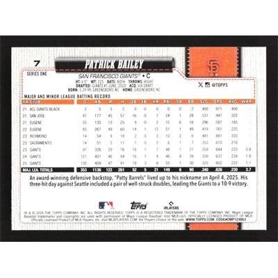 This is a 2026 Topps Patrick Bailey baseball card. The card is #7 and pictures show condition.