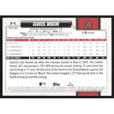 This is a 2026 Topps Gabriel Moreno baseball card. The card is #71 and pictures show condition.
