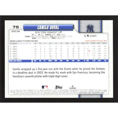 This is a 2026 Topps Camilo Doval baseball card. The card is #75 and pictures show condition.