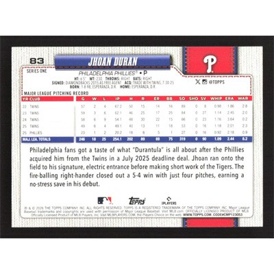This is a 2026 Topps Jhoan Duran baseball card. The card is #83 and pictures show condition.