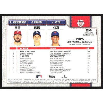 This is a 2026 Topps Kyle Schwarber, Shohei Ohtani and Juan Soto League Leaders baseball card. The card is #84 and pictures show condition.