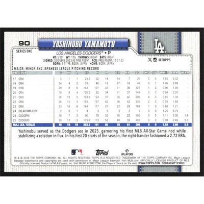 This is a 2026 Topps Yoshinobu Yamamoto baseball card. The card is #90 and pictures show condition.