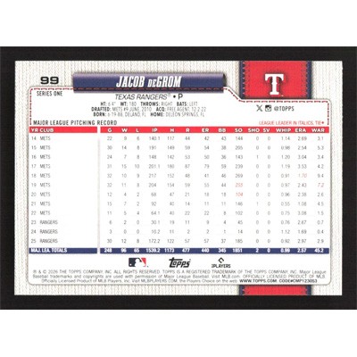 This is a 2026 Topps Jacob deGrom baseball card. The card is #99 and pictures show condition.