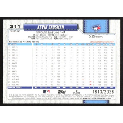 This is a 2026 Topps Gold Kevin Gausman baseball card. The card is #311 and pictures show condition. This card is limited; #'d 1613/2026.