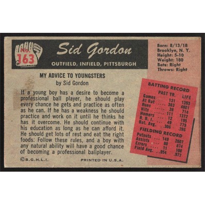This is a 1955 Bowman Sid Gordon baseball card. The card is #163 and pictures show condition.