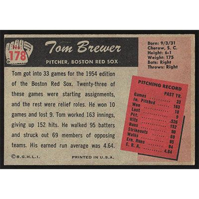This is a 1955 Bowman Tom Brewer baseball card. The card is #178 and pictures show condition.