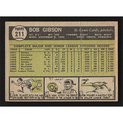 This is a 1961 Topps Bob Gibson baseball card. The card is #211 and pictures show condition.