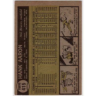 This is a 1961 Topps Hank Aaron baseball card. The card is #415. Please see photos for condition information.