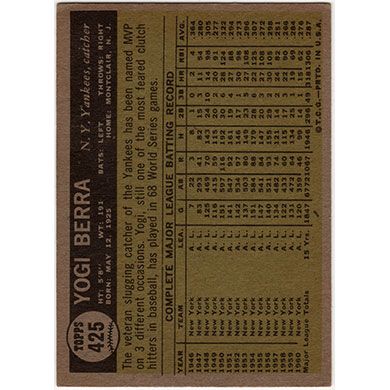 This is a 1961 Topps Yogi Berra baseball card. The card is #425. Please use photos to judge condition.