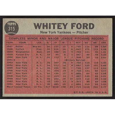 This is a 1962 Topps Whitey Ford In Action baseball card. The card is #315 and pictures show condition.