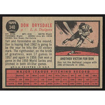 This is a 1962 Topps Don Drysdale baseball card. The card is #340 and pictures show condition.