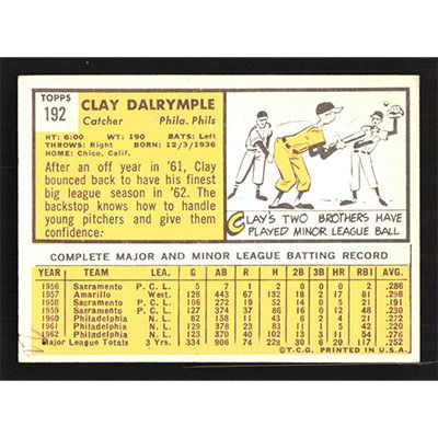 This is a 1963 Topps Clay Dalrymple baseball card. The card is #192 and pictures show condition.