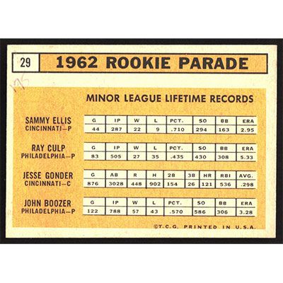 This is a 1963 Topps Sammy Ellis, Ray Culp, Jesse Gonder and John Boozer 1962 Rookie Stars baseball card. The card is #29 and pictures show condition. Team(s): Cincinnati Reds/Philadelphia Phillies Rookie Card (RC)