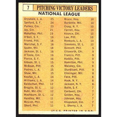 This is a 1963 Topps Don Drysdale, Jack Sanford, Bob Purkey, Joe Jay, Art Mahaffey and Billy O'Dell League Leaders baseball card. The card is #7 and pictures show condition.