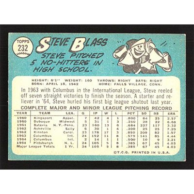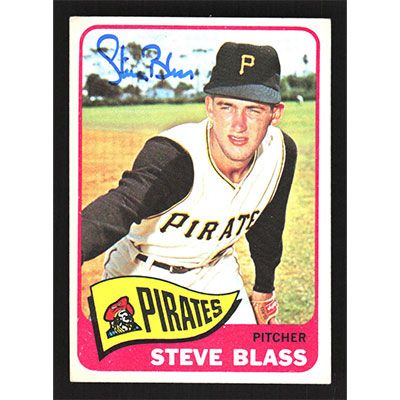 This is a 1965 Topps Steve Blass autographed baseball card. This card has been signed, in blue, by Steve Blass, and is guaranteed authentic by Ballcardz.com. The card is #232 and pictures show condition.