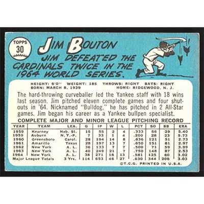 This is a 1965 Topps Jim Bouton baseball card. The card is #30 and pictures show condition.