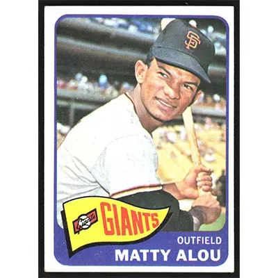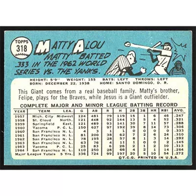 This is a 1965 Topps Matty Alou baseball card. The card is #318 and pictures show condition.