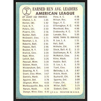 This is a 1965 Topps Dean Chance/Joel Horlen League Leaders Checklist baseball card. The card is #7 and pictures show condition. Team(s): Los Angeles Angels/Chicago White Sox