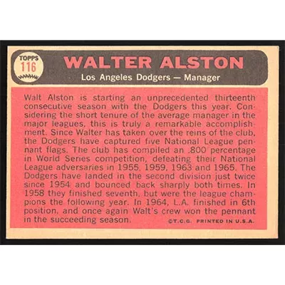 This is a 1966 Topps Walt Alston baseball card. The card is #116 and pictures show condition.