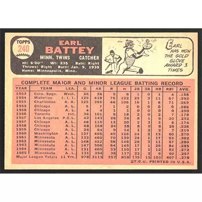 This is a 1966 Topps Earl Battey baseball card. The card is #240 and pictures show condition.