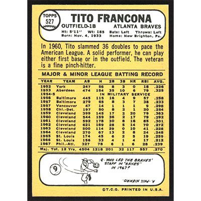This is a 1968 Topps Tito Francona baseball card. The card is #527 and pictures show condition.
