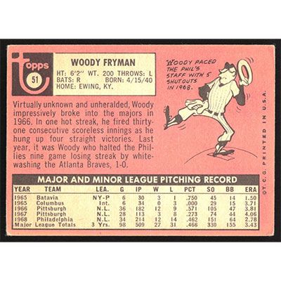 This is a 1969 Topps Woody Fryman baseball card. The card is #51 and pictures show condition.