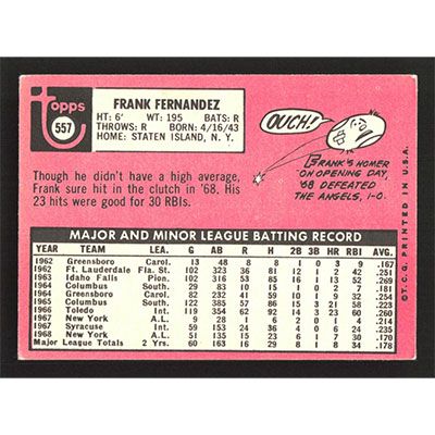 This is a 1969 Topps Frank Fernandez baseball card. The card is #557 and pictures show condition.