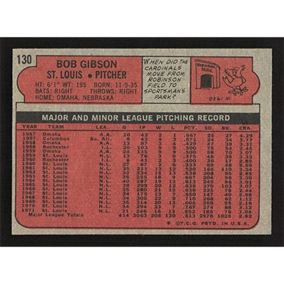 This is a 1972 Topps Bob Gibson baseball card. The card is #130 and pictures show condition.