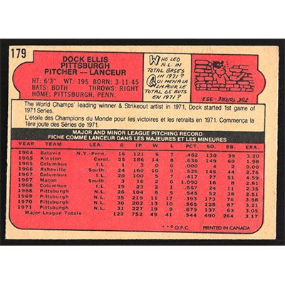 This is a 1972 Topps Dock Ellis baseball card. The card is #179 and pictures show condition.