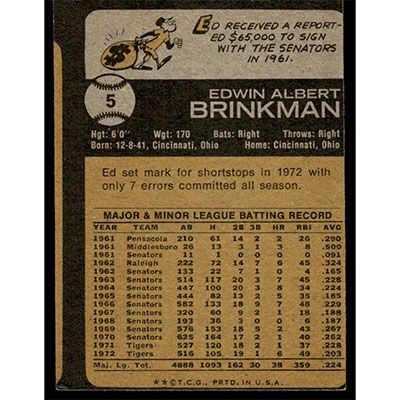 This is a 1973 Topps Ed Brinkman Miscut baseball card. The card is #5 and pictures show condition.