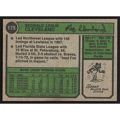 This is a 1974 Topps Reggie Cleveland baseball card. The card is #175 and pictures show condition.
