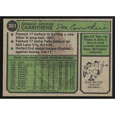 This is a 1974 Topps Don Carrithers baseball card. The card is #361 and pictures show condition.