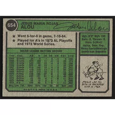 This is a 1974 Topps Jesus Alou baseball card. The card is #654 and pictures show condition.