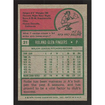 This is a 1975 Topps Rollie Fingers baseball card. The card is #21 and pictures show condition.