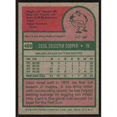 This is a 1975 Topps Cecil Cooper baseball card. The card is #489 and pictures show condition.