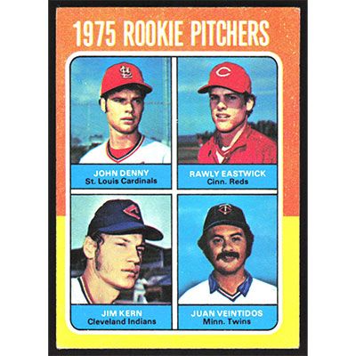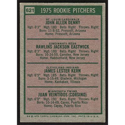 This is a 1975 Topps John Denny, Rawly Eastwick, Jim Kern and Juan Veintidos Rookie Pitchers baseball card. The card is #621 and pictures show condition.