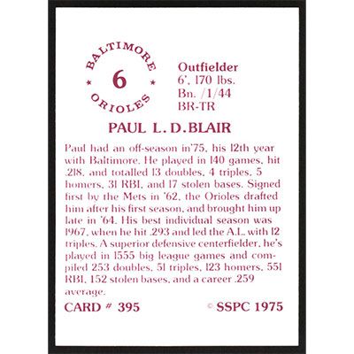 This is a 1976 SSPC Paul Blair baseball card. The card is #395 and pictures show condition.