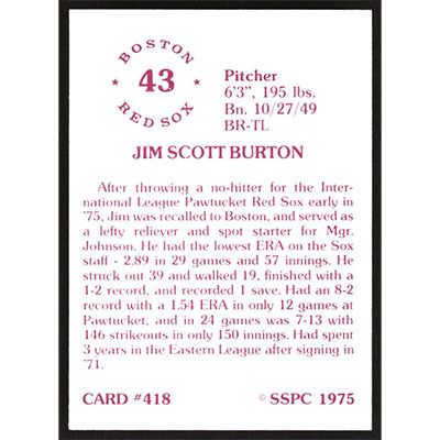 This is a 1976 SSPC Jim Burton baseball card. The card is #418 and pictures show condition.