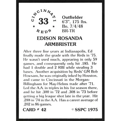 This is a 1976 SSPC Ed Armbrister baseball card. The card is #42 and pictures show condition.