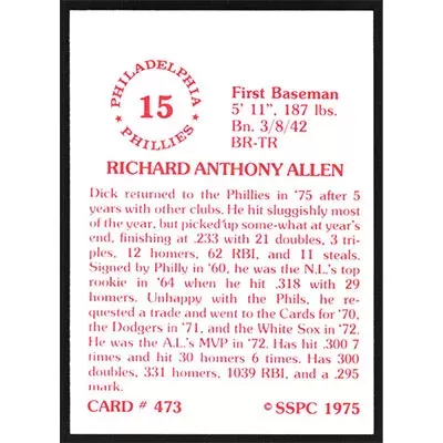 This is a 1976 SSPC Dick Allen baseball card. The card is #473 and pictures show condition.