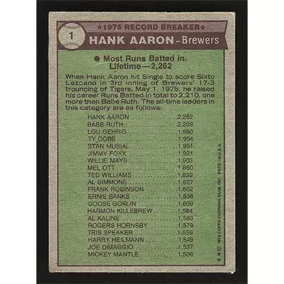 This is a 1976 Topps Hank Aaron baseball card. The card is #1 and pictures show condition.