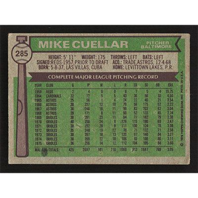 This is a 1976 Topps Mike Cuellar baseball card. The card is #285 and pictures show condition.