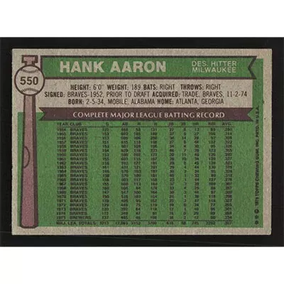 This is a 1976 Topps Hank Aaron baseball card. The card is #550 and pictures show condition.