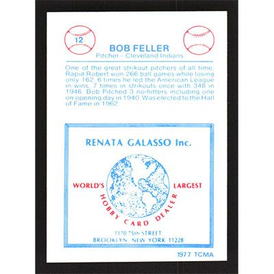 This is a 1977 Galasso Glossy Greats Bob Feller baseball card. The card is #12 and pictures show condition.