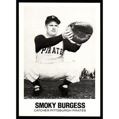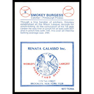 This is a 1977 Galasso Glossy Greats Smoky Burgess baseball card. The card is #6 and pictures show condition.