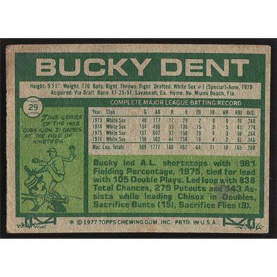 This is a 1977 Topps Bucky Dent baseball card. The card is #29 and pictures show condition.