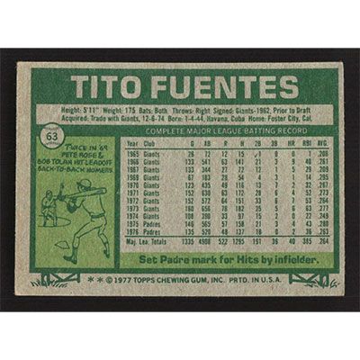 This is a 1977 Topps Tito Fuentes baseball card. The card is #63 and pictures show condition.