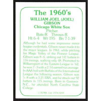 This is a 1978 TCMA 60's Joel Gibson baseball card. The card is #208 and pictures show condition.
